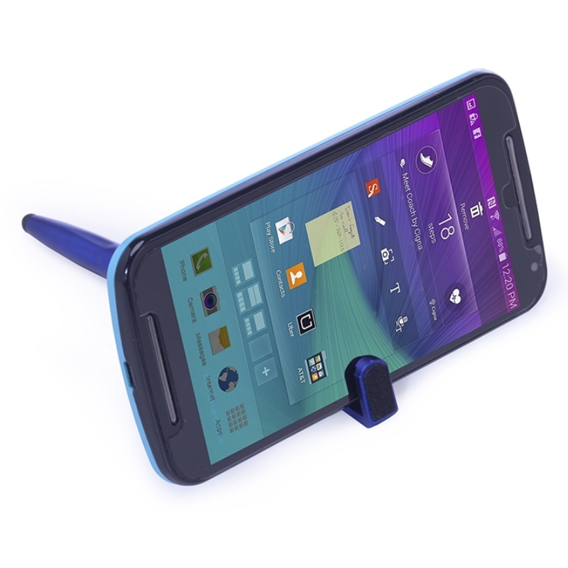 Caneta plástica personalizada multifuncional com ponteira touch, suporte para celular e limpador de tela. Brinde tecnológico ideal para ações corporativas e promocionais.